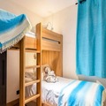 Inside, the apartment is a haven of comfort and style. The fully equipped kitchen opens to a cozy living area with a single sofa bed and pull-out bed, perfect for unwinding after a day in the mountains. Three thoughtfully designed sleeping areas provide ample space for up to eight guests, featuring twin beds, a bunk bed, and plenty of storage. A private shower room, a bathroom with two separate toilets, and a south-east facing terrace and balcony with outdoor furniture complete the space, offering both practicality and charm.