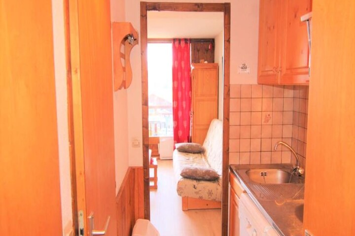In the serene lower part of the resort, this charming studio apartment offers a cozy retreat for your alpine getaway. With its south-facing balcony, you can soak in the warm sunlight and enjoy the crisp mountain air, creating the perfect setting for relaxation after a day of adventure. The residence is conveniently located below the main avenue, just a short stroll from the Carrets chairlifts and the ESF ski school meeting points, ensuring easy access to the slopes and ski lessons for all levels. Nearby, a sports shop and mini-market provide everything you need for a comfortable stay. \n\nThe apartment, situated on the first floor of the residence (accessible via half a flight of stairs), is thoughtfully designed to maximize space and comfort. The living room features a 140cm sofa bed, seamlessly connected to an open-plan kitchenette equipped for preparing hearty meals. A cozy sleeping alcove includes two 80cm bunk beds and an additional 80cm pull-out bed, making it ideal for families or small groups. The bathroom and separate WC add convenience, while the south-facing balcony invites you to unwind with a view. Please note, the upper bunk is not suitable for children under 6 years old. \n\nThis 1-star classified tourist accommodation provides a simple yet welcoming base for exploring the breathtaking surroundings. Whether you’re here to ski, hike, or simply relax, the location ensures you’re never far from the action. The proximity to the Carrets chairlifts and ESF ski school makes it an excellent choice for both beginners and seasoned skiers alike. \n\nWith its blend of practicality and charm, this studio apartment is a delightful choice for those seeking an affordable and convenient alpine escape. Let the beauty of the mountains and the convenience of this location create unforgettable memories for your next holiday.