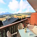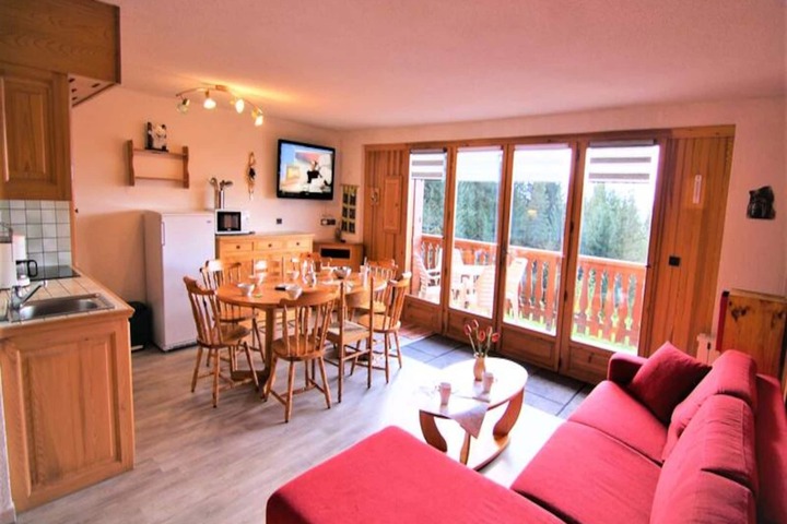 High above the charming resort of Les Saisies, this cozy holiday apartment offers a serene retreat with breathtaking views of the Beaufortain mountain range, Mont Bisanne, and the picturesque village below. Whether you're seeking a peaceful alpine escape or an active mountain adventure, this property provides the perfect base to immerse yourself in the beauty of the French Alps. The south-facing raised balcony invites you to soak in the sunshine while savoring the panoramic vistas of the surrounding peaks. \n\nInside, the apartment is thoughtfully designed to accommodate up to six guests. The living room, with its open-plan fitted kitchen, creates a welcoming space for shared meals and relaxation after a day of exploration. The sleeping arrangements include a cozy alcove with a double bed, a windowless bedroom with another double bed, and an additional sleeping alcove with bunk beds, ideal for families or groups of friends. Please note that the upper bunk is not suitable for children under six. A modern shower room and separate WC complete the layout, ensuring comfort and convenience throughout your stay.\n\nLocated at the top of the resort, this residence offers easy access to the heart of Les Saisies, where you can enjoy a variety of shops, restaurants, and activities. In winter, the area transforms into a skier's paradise with pristine slopes and stunning snow-covered landscapes. During the warmer months, the region comes alive with hiking trails, cycling routes, and opportunities to explore the unspoiled natural beauty of the Alps. \n\nWhether you're here to ski, hike, or simply unwind in the fresh mountain air, this charming apartment promises an unforgettable alpine getaway for all seasons.
