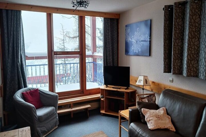 This charming 4-room duplex apartment in the heart of Les Arcs 1800 offers a comfortable stay for up to 8 people. The apartment includes a living room with a 140 cm convertible sofa for 2 people, a bedroom with 2 twin beds, a second bedroom with a double bed, and a cabin with a set of 80 cm bunk beds (the high bed is not suitable for children under 6). The apartment is non-smoking, pet-free, and features a TV with DVD/USB. Bed and bathroom linen are available for an additional charge, and the apartment is equipped with heating. A 700 euro deposit is required.