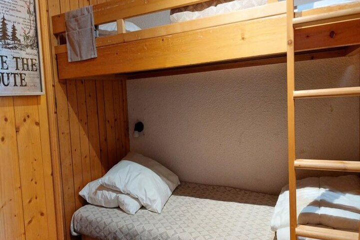 This 40m² apartment is located on the 11th floor of a residence with elevator access, offering a comfortable stay for up to 6 people. It features a living room with two single beds, a bedroom with two single beds, and a mountain corner with two bunk beds (note: the upper bunk is not suitable for children under 6 years old). Pets are welcome, making it a great choice for pet owners. The apartment is non-smoking and comes with essential bedding such as duvets, but bed linen is not provided. A TV and Wi-Fi access are available for entertainment.