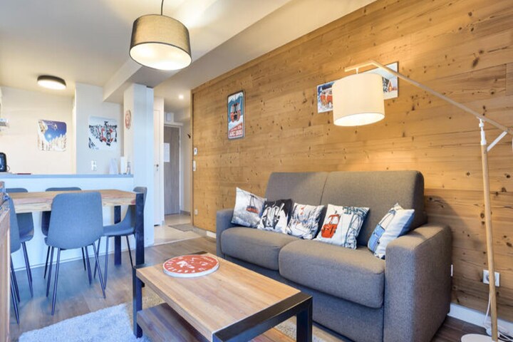 This charming apartment, located in the heart of the Arcs 1800 resort, offers a cozy retreat for up to 4 guests. The apartment features a south-facing balcony with a stunning mountain view, perfect for enjoying sunny days. It includes 2 bedrooms: one with a queen-size bed and the other with two single beds. The living room has a comfortable sofa bed (140x200cm) for extra guests, along with a standard sofa, coffee table, and seating for 3. The property is pet-friendly (with an additional charge), and a covered parking space is provided.