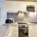 The apartment comes equipped with an American-style kitchen, a shower-equipped bathroom with an electric towel dryer, and a separate toilet. Additional amenities include a hairdryer, storage space, and a baby kit (subject to availability). The apartment also features a high-quality living space, maintained with modern amenities to ensure a comfortable stay.