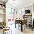 The apartment features an American-style kitchen with modern appliances like a fridge, stove, and microwave for easy meal prep. The bathroom is well-equipped with a hairdryer and ample storage. The residence offers a tranquil environment, perfect for unwinding after exploring nearby attractions.
