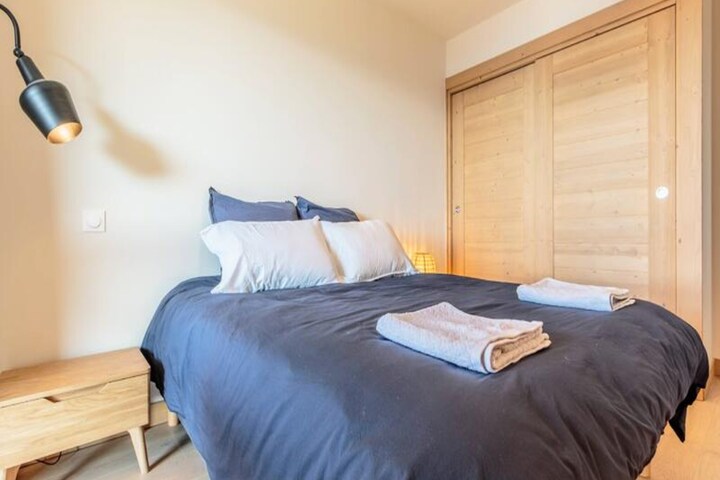 The apartment boasts a fully equipped modern kitchen with an induction hob, dishwasher, and raclette grill, ideal for enjoying meals after a day on the slopes. Relax in the living area or on the balcony with stunning mountain views. Guests have access to a wellness center featuring a heated indoor pool, sauna, hammam, and gym. A ski locker with boot and glove dryers ensures every detail is designed for a seamless mountain getaway.