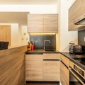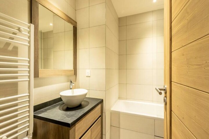 The apartment includes a fully equipped kitchen with an induction hob, dishwasher, microwave, fridge, and coffee makers. Enjoy a spacious living room with a 65-inch connected TV offering Apple TV and Netflix. The residence offers access to a wellness area with an indoor pool, spa, sauna, and gym, as well as ski lockers and concierge services.