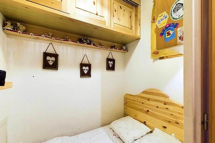 This 27m² studio cabin includes a mountain corner with a single folding bed, a shower room, and a separate toilet. The living room offers a convertible sofa for two people, while the kitchenette is equipped with 2 electric hotplates, a grill, and a refrigerator. The cabin also has a double bed in a separate sleeping area, providing ample space for guests. A flat-screen TV is provided for your entertainment, and the apartment includes a ski locker for storing equipment.