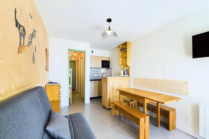 This charming studio apartment is located just 50 meters from the slopes and the Manessier ski lift, offering a prime location for winter sports enthusiasts. Accommodating up to 4 guests, the 26m² studio is completely renovated and boasts a south-facing terrace with stunning views of the valley. The apartment features a cozy entrance with 2 bunk beds and a living room with a convertible sofa bed for 2. Amenities include LED TV and a ski locker for your convenience. The apartment is not pet-friendly, and smoking is not allowed.