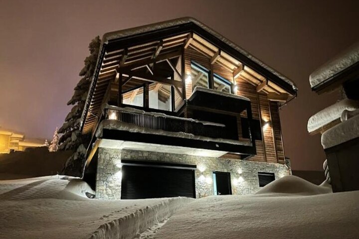 The chalet features a fully equipped American kitchen with an induction hob, fridge/freezer, dishwasher, oven, and microwave. A spacious living room with a fireplace, dining area, and a 51m² relaxation area with a swimming pool, sauna, and shower make it ideal for relaxation. Three garage parking spaces with electric vehicle charging are provided. End-of-stay cleaning, sheets, and towels are included in the rental.