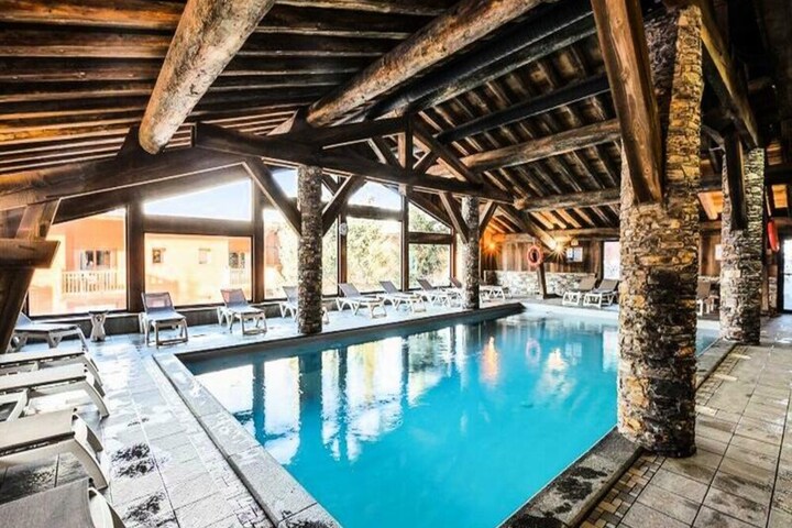 The apartment features a fully equipped kitchen, perfect for preparing meals with family and friends. Bathrooms include a bathtub and shower, and there is a separate toilet. For additional relaxation, guests can enjoy the residence's indoor heated swimming pool, sauna, and hammam. The property also offers a cardio-training room for fitness enthusiasts. Whether you're here for the slopes or relaxation, this apartment provides the perfect retreat.