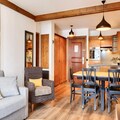 Inside the apartment, you’ll find a fully equipped American-style kitchen, making meal preparation simple and enjoyable. Additional features include a spacious living area with comfortable seating and a fireplace. The bathroom is well-appointed, and the accommodation includes high-quality linens and towels. Guests can also enjoy the use of outdoor heated pools and saunas, with parking available upon request.