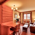 The apartment is fully equipped with a well-appointed American-style kitchen, featuring a dining table for six. The bathroom includes a bathtub with a shower column and additional conveniences like a hairdryer, heated towel racks, and ample storage space. A private parking space is available for your convenience. Guests can also enjoy access to a shared heated outdoor pool, while certain residences offer access to a heated indoor pool and spa facilities for relaxation after a day of adventure.