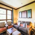 The apartment is fully equipped for self-catering with a kitchen that opens into the living space. There are two bathrooms: one with a bathtub-shower combination and the other with a shower. Additional amenities include towels, housekeeping services, and access to the communal heated outdoor pool, sauna, and fitness center. Parking is available for an additional fee, and there is a baby kit available upon request.