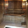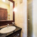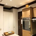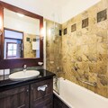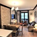 The fully equipped kitchen opens to the living area, perfect for preparing meals at home. The two bathrooms include a bathtub-shower combination and a separate shower, ensuring comfort and convenience. Additional amenities include towels, housekeeping, and access to communal outdoor heated pools. Guests can also enjoy the sauna, fitness center, and parking options, with baby kits available upon request for families traveling with young children.