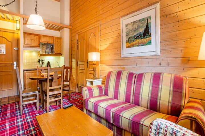 This spacious and comfortable apartment is designed to accommodate up to four guests, featuring two single beds and a convertible sofa. It offers modern amenities such as a flat-screen TV, Wi-Fi, and ski-in, ski-out access. Guests will enjoy a cozy atmosphere with a private balcony showcasing stunning mountain views. The property is pet-friendly, with a surcharge, and offers a wellness area with a sauna, hot tubs, and a fitness center, ensuring a relaxing stay after a day on the slopes.