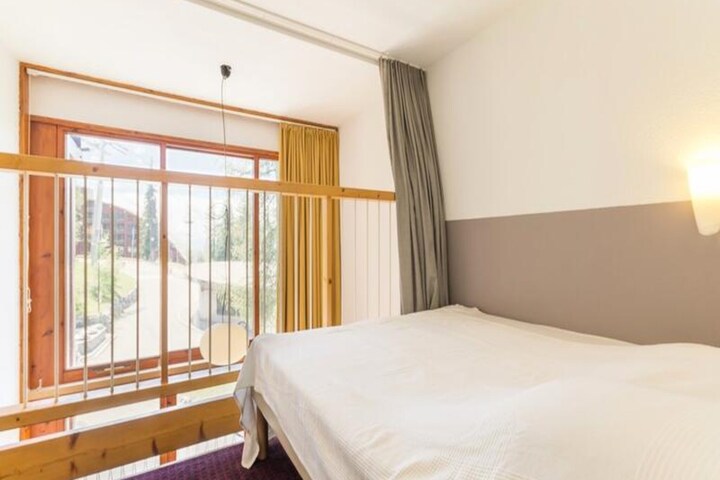 Designed for up to five guests, the apartment features a thoughtful layout that combines comfort and functionality. The entrance hall leads to a fully equipped kitchen with modern appliances, including ceramic hobs, a microwave/grill, a refrigerator, a dishwasher, and an electric coffee maker. The living room, with its single bed and TV, is a cozy space to unwind after a day on the slopes. Upstairs, the mezzanine offers a sleeping alcove with bunk beds and a bathroom, while a separate bedroom with two single beds overlooks the living area. The southwest-facing balcony is the perfect spot to relax and take in the stunning alpine scenery.
