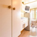 Designed to comfortably accommodate up to four guests, the studio features a practical layout with a pull-out sofa bed in the living room and an additional sofa bed in the sleeping alcove near the entrance. The fully equipped kitchen includes an electric stovetop, mini oven, refrigerator, combination microwave, and dishwasher, making it easy to prepare meals and enjoy cozy evenings in. A flat-screen TV adds to the comfort, while eco-friendly linens and end-of-stay cleaning services are available for an additional fee, ensuring a hassle-free stay.