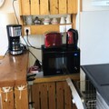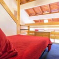Inside, the 30m² studio is thoughtfully designed to accommodate up to six guests. The bright living room features a dining table, a comfortable sofa bed, a trundle bed, and a TV, creating a cozy space to unwind after a day of adventure. The mezzanine level adds charm and functionality, offering two bunk beds and a separate area with a double bed and flat-screen TV, ensuring privacy and comfort for all. The fully equipped kitchenette includes ceramic hobs, a refrigerator, a microwave, and a dishwasher, making meal preparation a breeze. The bathroom, complete with a bathtub, adds a touch of relaxation to your stay.