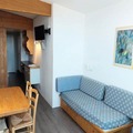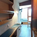 Inside, the 25m² studio is thoughtfully designed to maximize comfort and functionality. The living area features two single beds, while a sleeping alcove with bunk beds provides additional space, making it ideal for families or small groups. The fully equipped kitchen includes electric hobs, a combination oven/microwave, a dishwasher, and a refrigerator, ensuring you have everything needed to prepare hearty meals after a day of adventure. A bathroom with a bathtub and toilet adds to the convenience, while the living room’s television offers a cozy spot to unwind.