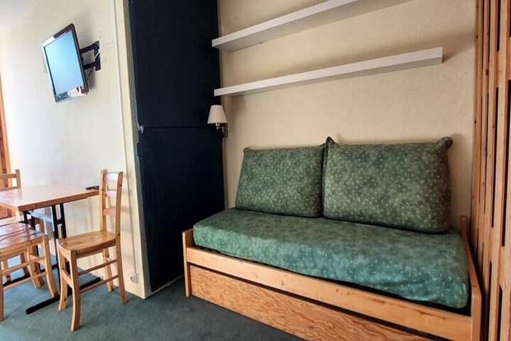 Step into a thoughtfully designed 25m² space, perfect for up to four guests. The studio features a southwest-facing balcony that captures the golden hues of the setting sun over the slopes. The living area is equipped with a single bed and a trundle bed, while a sleeping alcove offers additional flexible sleeping arrangements. A fully equipped kitchen, complete with a ceramic hob, oven, microwave, dishwasher, and refrigerator, ensures you can prepare hearty meals after a day of exploration. The bathroom, with its inviting bathtub, provides a relaxing retreat. Modern conveniences like a television and elevator access enhance your stay, while the pet-friendly policy ensures no family member is left behind.