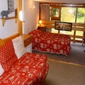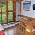 The apartment spans 33m² and comfortably accommodates up to five guests, making it ideal for families or small groups. Upstairs, you'll find a cozy bedroom with a double bed, a sleeping alcove with a pull-out sofa, and a bunk bed area perfect for kids. The open-plan kitchen is fully equipped with modern appliances, including a dishwasher, microwave, and coffee maker, ensuring you have everything you need to prepare hearty meals after a day on the slopes. The living room, complete with a television, offers a welcoming space to relax and unwind.