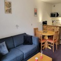 Step into this cozy 28m² studio, thoughtfully designed to accommodate up to five guests. The cabin area features two bunk beds and a trundle bed, while the living room boasts a comfortable double sofa bed. The south/southeast-facing balcony invites you to savor panoramic views of the resort and slopes, creating a serene backdrop for your mornings and evenings. The well-equipped kitchen, complete with ceramic hobs, a mini oven, microwave, refrigerator, dishwasher, and more, ensures you have everything needed to prepare hearty meals after a day on the slopes. Modern amenities such as free Wi-Fi and a flat-screen TV add to the comfort of your stay.