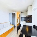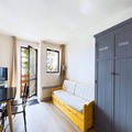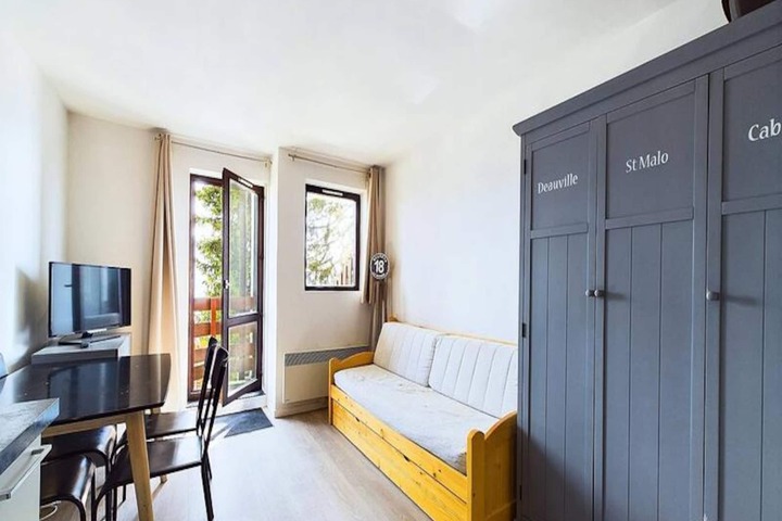 Newly renovated and rated 2 stars, this bright 22 m² studio comfortably accommodates up to four guests. The clever layout features an entrance hall with two bunk beds, separated from the living area by a curtain for added privacy. The living room boasts a sofa with trundle beds, a TV, and access to a south-facing balcony that floods the space with natural light and offers stunning mountain views. The kitchenette is equipped with a ceramic hob, refrigerator, oven, and microwave, making it easy to prepare meals after a day on the slopes. A modern shower room and separate toilet complete the amenities, ensuring a comfortable stay. A ski locker is also provided for your convenience.