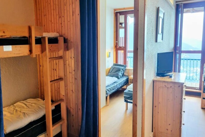 High above the Tarentaise Valley, this inviting apartment in the Nova 3 residence offers a perfect blend of alpine charm and modern convenience. Situated in the heart of Villards, Les Arcs 1800, it boasts ski-in/ski-out access, making it an ideal choice for winter sports enthusiasts. Whether you're gazing at the fir trees from the northeast-facing windows or soaking in the breathtaking valley sunsets from the southwest-facing balcony, every moment here feels like a retreat into nature's beauty. The residence is conveniently located near shops and shuttle stops, ensuring easy access to everything the resort has to offer. \n\nDesigned for up to six guests, the apartment features a cozy living room with two sofa beds, a cabin area with bunk beds, and a separate bedroom with twin beds. The fully equipped kitchen includes electric hobs, a microwave, mini-oven, refrigerator, dishwasher, and essential appliances like a coffee maker and toaster, allowing you to prepare hearty meals after a day on the slopes. The bathroom and separate toilet add to the comfort, while eco-friendly linens and cleaning services are available for an additional fee. Free Wi-Fi ensures you stay connected, and the covered parking included in the rental price adds convenience to your stay. \n\nBeyond the residence, Les Arcs 1800 offers a vibrant mix of activities year-round. In winter, explore the expansive Paradiski domain, renowned for its world-class slopes and stunning alpine vistas. Summer transforms the region into a haven for hikers, cyclists, and nature lovers, with trails winding through lush landscapes and opportunities for paragliding over the valley. The nearby shopping mall, restaurants, and après-ski options ensure that relaxation and entertainment are always within reach. \n\nWhether you're seeking thrilling adventures or peaceful moments surrounded by nature, this apartment provides the perfect base for creating unforgettable memories in the French Alps.