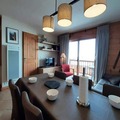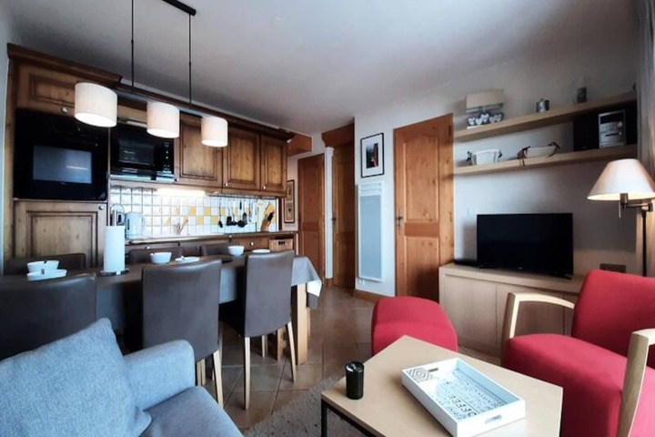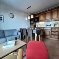 Inside, the apartment is thoughtfully designed to accommodate up to six guests. The living and dining area features a comfortable 140cm sofa bed and a TV, creating a warm and inviting space to unwind. The master bedroom boasts a plush double bed (160cm) and an en-suite shower room, while a second bedroom offers another double bed (160cm). The fully equipped kitchen includes modern appliances such as induction hobs, an oven, a microwave, a refrigerator, a dishwasher, and more—everything you need to prepare hearty meals after a day on the slopes. Additional amenities include a ski locker, covered parking, and bed linens provided for your convenience.