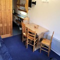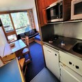 Designed to comfortably accommodate up to four guests, the studio features a thoughtfully arranged mountain corner with two bunk beds and a living area equipped with two sofa beds. The kitchenette is compact yet fully equipped, including two electric burners, a mini-oven, microwave, dishwasher, and more—ideal for preparing hearty meals after a day on the slopes. The northeast-facing balcony provides a tranquil spot to unwind, offering panoramic views of the majestic landscape. Modern amenities such as free resort Wi-Fi and a flat-screen TV ensure a comfortable and connected stay, while eco-friendly linens and end-of-stay cleaning are available for added convenience.