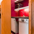 Inside, the 40m² apartment is thoughtfully designed to accommodate up to six guests. The living room features a pull-out sofa bed, while a separate bedroom offers a comfortable double bed. A cozy sleeping alcove with bunk beds adds to the charm, making it ideal for families or groups of friends. The fully equipped kitchen, complete with a refrigerator, dishwasher, and coffee maker, opens into the living area, creating a welcoming space for shared meals and relaxation. Modern amenities like Wi-Fi, a television, and a washing machine ensure a convenient and comfortable stay.