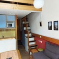 Spanning 33m², the apartment comfortably accommodates up to five guests. The living room features a cozy single sofa bed, while the mezzanine offers two single beds and an additional sleeping alcove with two more single beds, making it ideal for both relaxation and restful nights. The open-plan kitchen is fully equipped with modern appliances, including a ceramic hob, refrigerator, dishwasher, and microwave, ensuring you have everything needed to prepare hearty meals after a day on the slopes. A television in the living room adds to the comfort, while the bathroom with a bathtub provides a soothing retreat.