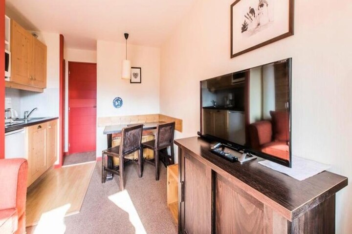 The open kitchen area is integrated into the living space, providing a convenient cooking setup for guests looking to self-cater during their stay. The apartment is well-maintained, with all essential furnishings in place to ensure a comfortable experience. A ski locker is available for storing gear, and a flat-screen TV ensures that guests can unwind after a day of activities. Optional services such as cleaning, towel changes, and a baby kit (subject to availability) can be arranged for added convenience. The property provides a solid balance of location, comfort, and affordability, offering a great value for those seeking a cozy alpine retreat.