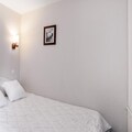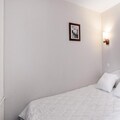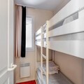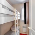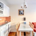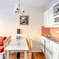 The 6-person rental includes a comfortable living room, a fully equipped kitchen, a bedroom with a double bed, a cabin area with two bunk beds, two bathrooms, and a separate toilet. Ideal for a family or small group, the apartment is designed with modern conveniences and cozy decor. Guests can also benefit from covered parking, ensuring a convenient stay.