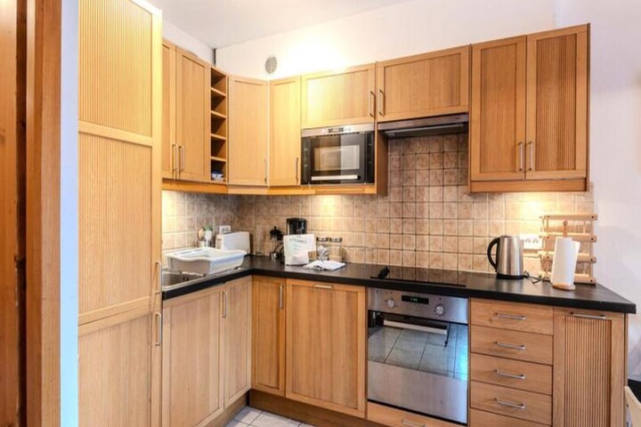 The apartment boasts a fully equipped kitchen with modern appliances, including a hob, microwave, oven, dishwasher, freezer, and a raclette machine for a taste of local cuisine. Additional facilities such as a washing machine, separate shower room, and ample storage enhance the convenience of longer stays. Guests are welcomed with bathroom products and cleaning supplies, ensuring a stress-free experience from arrival to departure.