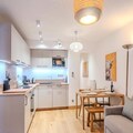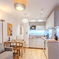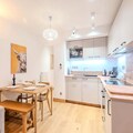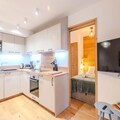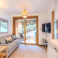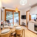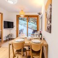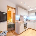The apartment is equipped with a fully functional kitchen that includes modern appliances such as an induction hob, oven, refrigerator, dishwasher, washing machine, toaster, kettle, and coffee maker. This setup allows for a self-sufficient stay, with all the necessary tools for preparing meals. Additional amenities include a shower room with a toilet, storage space for ski gear, and a bag of cleaning products to help guests maintain the apartment during their stay. With its thoughtfully designed layout and convenient location, this apartment offers a balanced mix of comfort and practicality for both short and extended stays.