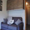 It comfortably accommodates up to 4 guests, featuring a well-equipped kitchenette with an induction hob, dishwasher, microwave, refrigerator, and essential appliances like a coffee maker, raclette machine, fondue set, kettle, and toaster. The living area includes a sofa bed and opens onto a balcony or terrace, perfect for enjoying the fresh mountain air. A dedicated mountain area with bunk beds offers additional sleeping space. The apartment also includes a bathroom, separate toilet, and a ski locker for your convenience.
