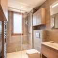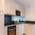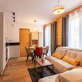 The apartment's open-plan living area includes a fully equipped kitchen with modern appliances, such as a refrigerator, oven, and microwave, ideal for self-catering. A ski locker and a cellar for bicycles provide secure storage for equipment. The apartment’s design includes a contemporary bathroom with a shower and WC. Heating is available throughout the property, ensuring guests’ comfort during their stay in all seasons.