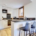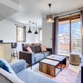 The spacious living room features an open, fully equipped kitchen, a dining area, and a lounge with access to the terrace, creating a perfect space for relaxation and socializing. Additional amenities include Wi-Fi, a washer/dryer, a dishwasher, a private garage, and a ski locker. Guests will enjoy the convenience of sheets and towels provided, beds made on arrival, and end-of-stay cleaning included.