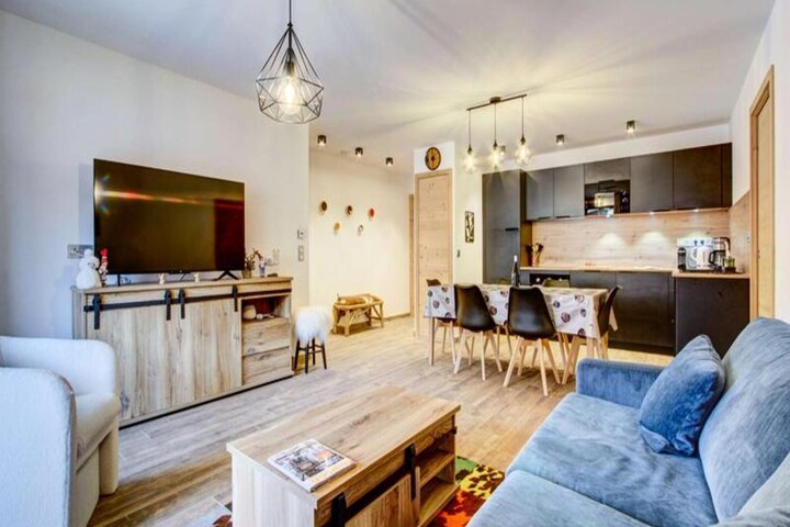 Property, along with its spacious layout, offers a well-equipped two-bedroom apartment capable of accommodating up to 6 people. The apartment includes a bedroom with a double bed, another with two single beds or a double bed option, and a sleeping area with two single bunk beds. The living room has a sofa bed for additional guests, providing flexibility. A private terrace offers a scenic view of Super-Morzine. The property is pet-free and offers essential services, including bed linens and towels, with beds made upon arrival. It is ideally suited for a comfortable stay, with end-of-stay cleaning included, but guests are required to pay for a deposit and tourist tax upon arrival.