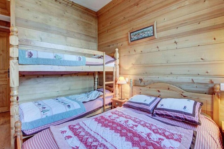 This spacious 2-bedroom apartment is located on the ground floor of a residence near the center, making it a convenient choice for families. Designed to accommodate 4 adults and 4 children, it offers a comfortable living space, including a living room with an open kitchen, sitting area, television, and a balcony. The first bedroom features a double bed and two single bunk beds, while the second bedroom also has a double bed and two single bunk beds. The apartment includes a shower room with a washing machine, a separate WC, and a bathroom. Additional amenities include outdoor parking, Wi-Fi, and a ski locker. During summer, guests can also use the cellar for bicycles. The apartment is a Summer Multipass member.