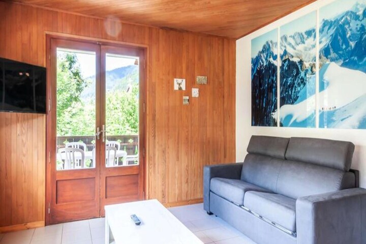 The apartment features a fully equipped kitchen that opens into the living room, which includes a sofa bed for two, French and English TV channels, and access to a south/west-facing terrace with stunning views of Morzine and the surrounding mountains. The property has two bedrooms—one with two single beds (which can be joined to form a double) and the other with a double bed. A modern shower room with a washing machine, along with a separate WC, completes the space.