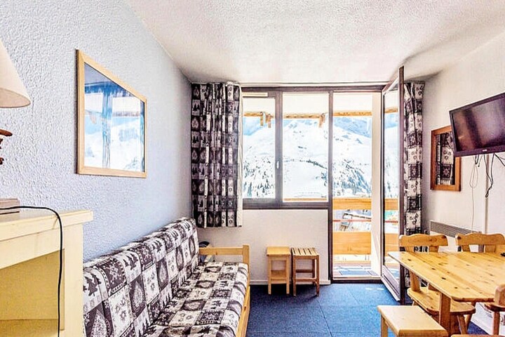 This cozy studio apartment in the heart of Avoriaz offers 25 m² of living space, comfortably accommodating up to 4 guests. The open-plan layout includes a living room with a kitchen area, a cabin sleeping space, a bathroom, and a separate toilet. Perfect for small families or groups, this apartment ensures a comfortable and functional stay with all the essentials. Enjoy a charming balcony in most units, where you can relax and take in the stunning surroundings.