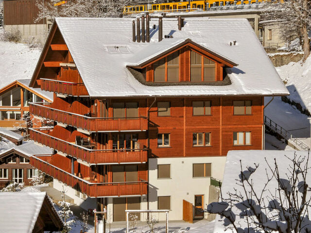 Child friendly apartment block "Bella Vista", built in 2006. 200 m from the centre of Wengen, on a slope, excellent location: right in the centre but still quiet. For shared use: well-kept garden (fenced). Children's playground (slide, swing). In the house: lift, central heating system. Pre-arrival grocery service. Shop, supermarket 200 m, restaurant 50 m, bar, bakery 200 m, 3 minute walk to the centre, bus stop "Lauterbrunnen (by train)" 3.2 km, railway station "Wengen" 200 m, outdoor swimming pool 600 m. Cable car, skisport facilities 250 m. Well-known lakes can easily be reached: Thunersee 13 km, Brienzersee 13 km. Please note: car-free holiday complex. Arrival via mountain railway. Additional accommodations can be booked. Arrival is only possible by train from Lauterbrunnen – 14 minutes driving time.