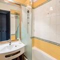 The apartment includes a fully equipped kitchen that opens to the living area, providing a convenient space for cooking meals. The bathroom features a bathtub with a shower and a toilet. For additional convenience, end-of-stay cleaning is mandatory, and daily cleaning services are available at an extra cost. Covered parking spaces can be reserved nearby, and a tourist tax applies on arrival. The apartment also offers optional Wi-Fi access for an additional fee, ensuring you stay connected during your stay.