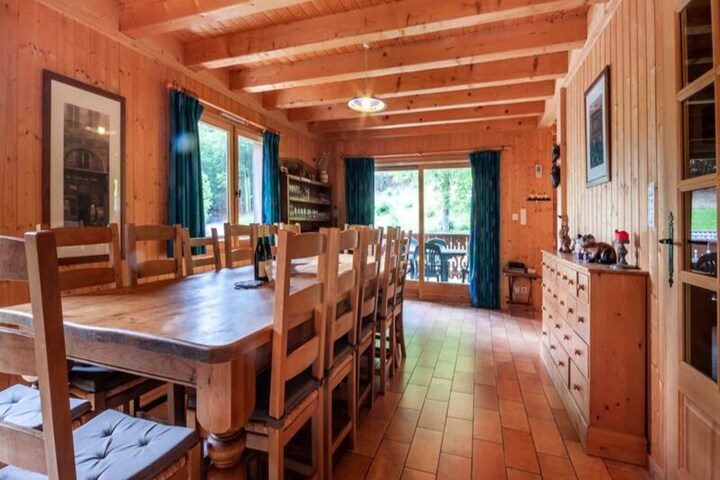 This spacious chalet accommodates up to 10 adults, with the option to host up to 14 guests using the sofa bed and mezzanine. It features five large bedrooms, each with an en-suite bathroom. The property is perfect for families or groups, offering ample sleeping arrangements, including a combination of double beds, single beds, and a baby bed. Sheets and towels are provided, and end-of-stay cleaning is included. Pets are not specified as allowed, but guests should confirm if needed.