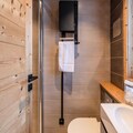 Inside, the 55m² apartment is thoughtfully designed to accommodate up to four guests. The fully equipped kitchen, complete with a Nespresso coffee machine, dishwasher, and induction hob, opens directly onto the garden, creating a seamless indoor-outdoor living experience. The dining area and cozy living room, featuring a wood-burning stove and television, provide the perfect space to unwind after a day of adventure. The two double bedrooms, one with an en-suite shower room and WC, promise restful nights, while the additional bathroom ensures comfort for all guests. Modern amenities such as Wi-Fi, a laundry room, and ski storage add to the convenience of your stay.