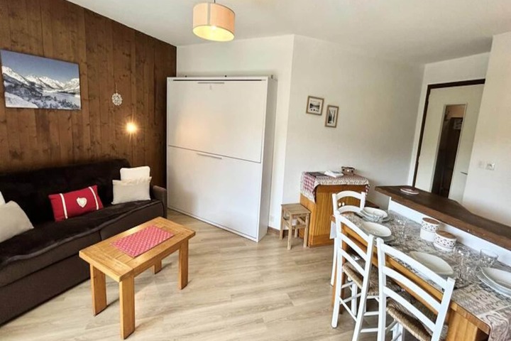 Located on the first floor of a building without an elevator, the apartment is accessible via approximately thirty steps. Inside, you’ll find a thoughtfully designed space featuring an entrance hall with storage, a bathroom equipped with a washer-dryer, and a separate toilet. The fully equipped kitchen seamlessly connects to the living and dining area, which includes two single fold-down beds (not suitable for children under six or adults), a double sofa bed, and a television. This layout is ideal for couples or small families seeking a comfortable and functional alpine getaway.