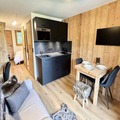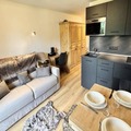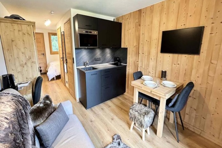 Located on the first floor of a complex comprising five chalets, the apartment is thoughtfully designed for comfort and convenience. It features an entrance hall with a cozy double bed, a modern shower room, and a separate toilet. The fully equipped kitchenette opens onto a bright living area, complete with a double sofa bed and a television, creating a welcoming space to unwind after a day of exploration. The south-facing balcony invites you to enjoy sunny afternoons with stunning views. Additional amenities include a ski locker and a covered outdoor parking space, ensuring a hassle-free stay.