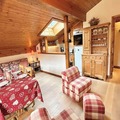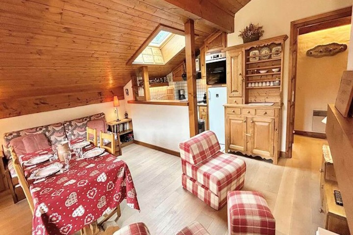 High above the charming streets of Megève, this cozy mountain apartment offers a serene retreat with breathtaking views and easy access to the region’s most sought-after attractions. Imagine waking up to the crisp alpine air, stepping onto your south-facing balcony, and planning a day filled with skiing, sports, or simply soaking in the beauty of the French Alps. Whether you’re here for winter adventures or summer escapes, this residence places you at the heart of it all. \n\nLocated on the second floor of a quiet residence, the apartment comfortably accommodates up to six guests. The thoughtful layout includes an entrance hall with two single bunk beds, a sleeping alcove with two additional bunk beds, and a private bedroom with two single beds and ample storage. The fully equipped kitchen opens onto a warm and inviting living/dining area, complete with a decorative fireplace that adds a touch of rustic charm. After a day on the slopes or exploring the village, unwind in this cozy space or enjoy the stunning views from the balcony. \n\nJust 450 meters from the Jaillet gondola lift and ski school, and a short 850-meter stroll to the village center, the location is ideal for both convenience and exploration. The nearby Palais des Sports, only six minutes away, offers a variety of activities for all ages, making this apartment perfect for families and groups. With a private garage and ski locker, your gear is always secure and easily accessible. \n\nWhether you’re drawn by Megève’s world-class skiing, vibrant village life, or tranquil summer hikes, this apartment provides the perfect base for unforgettable alpine memories. Let the charm of the French Alps inspire your next adventure.